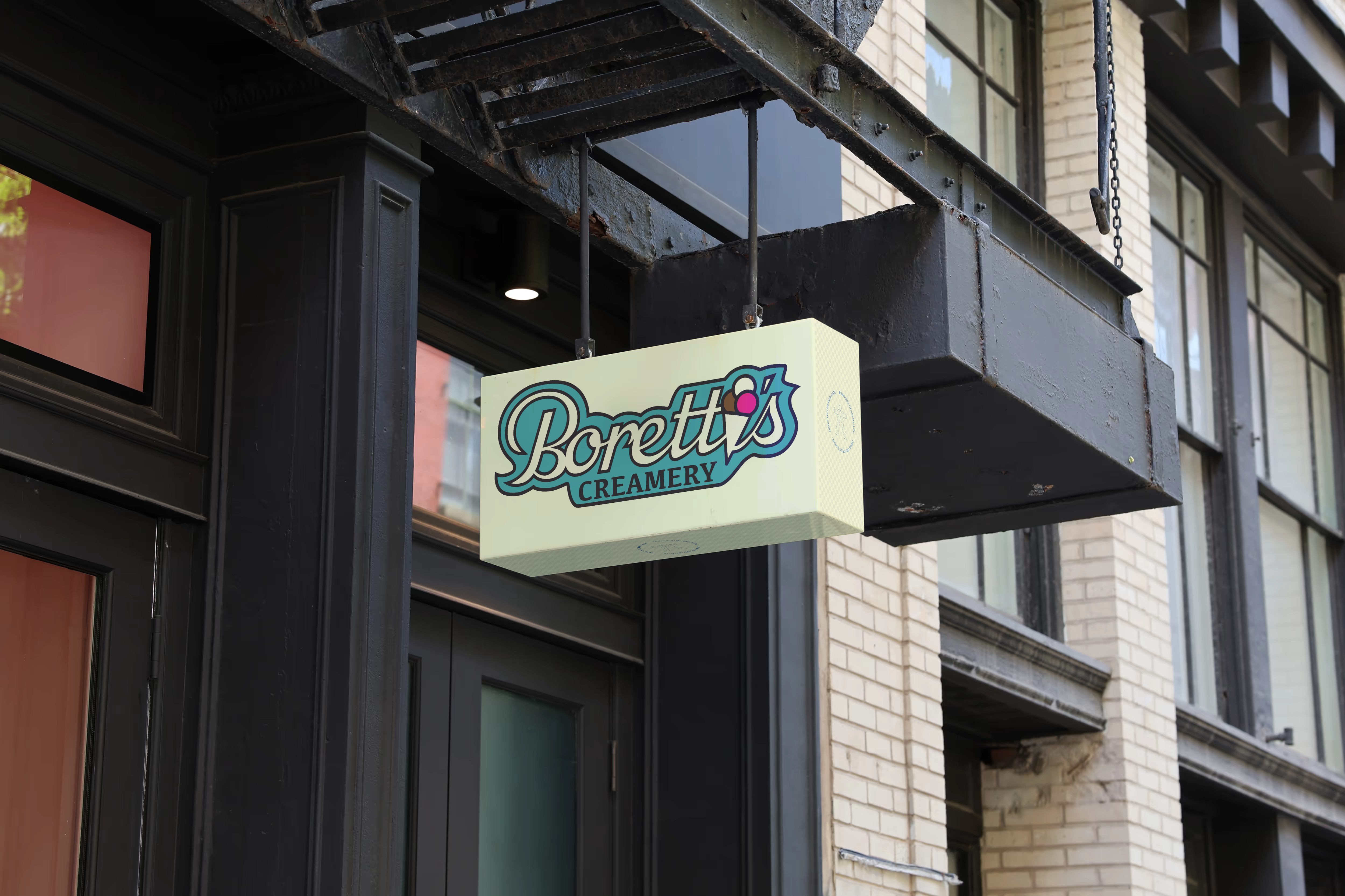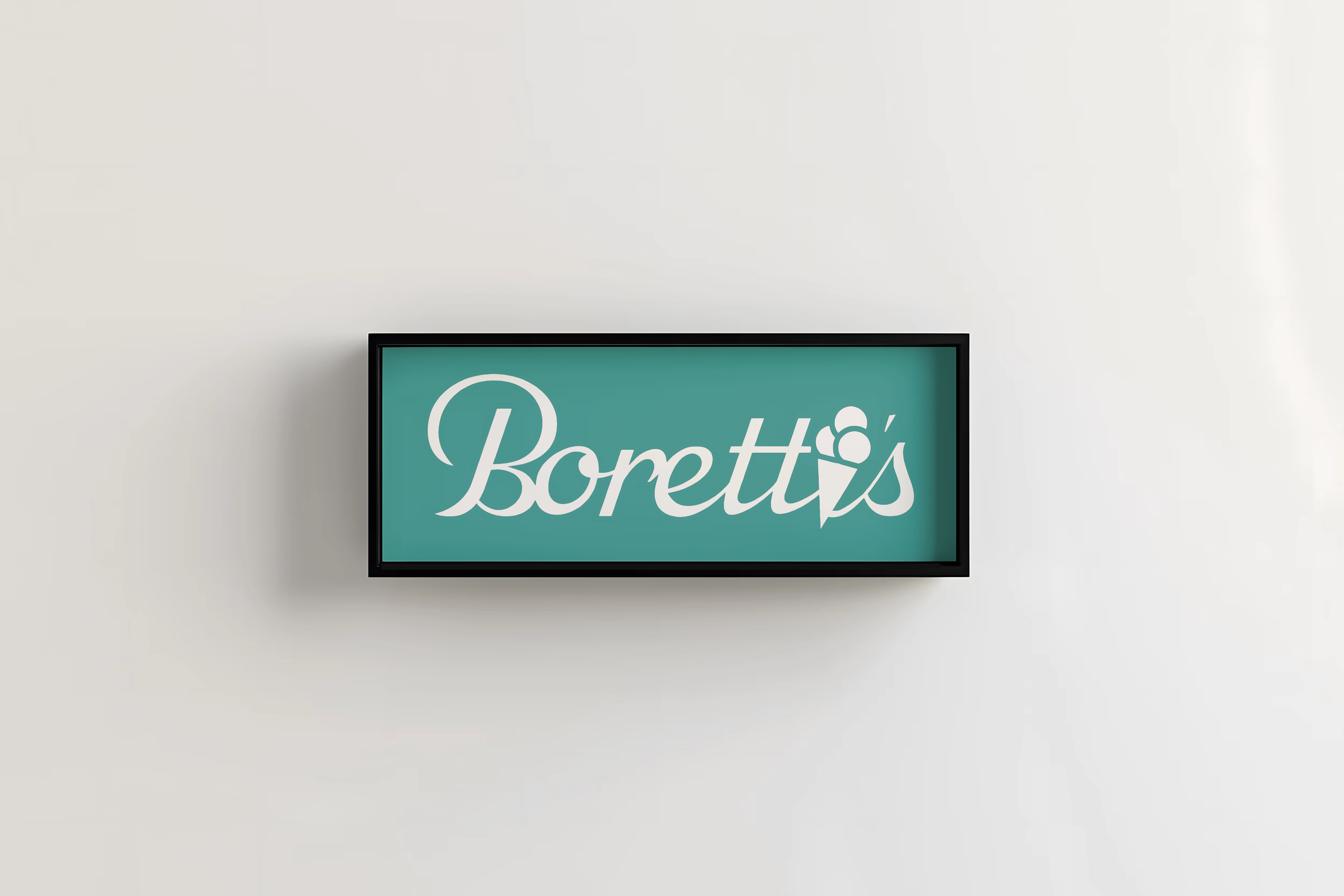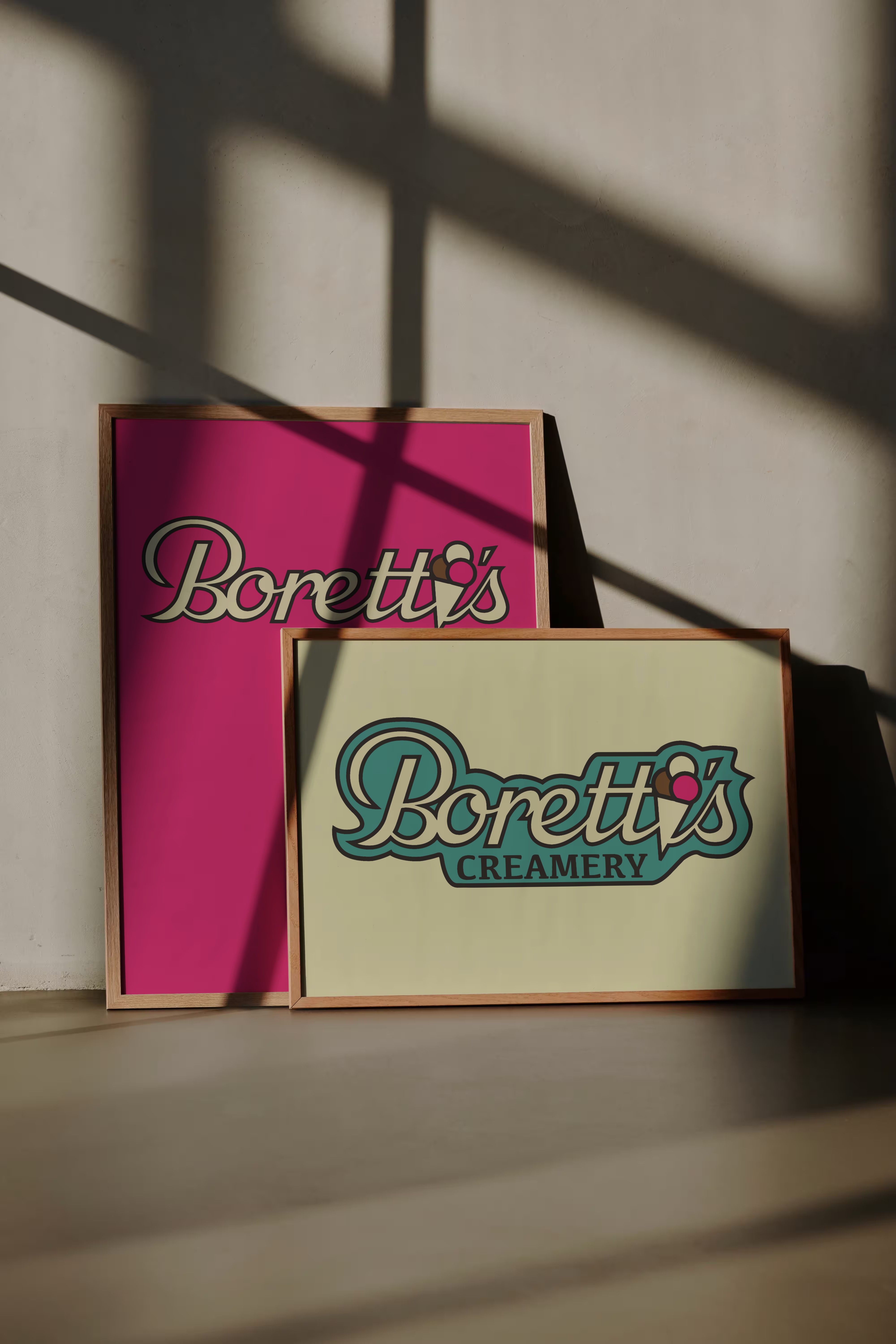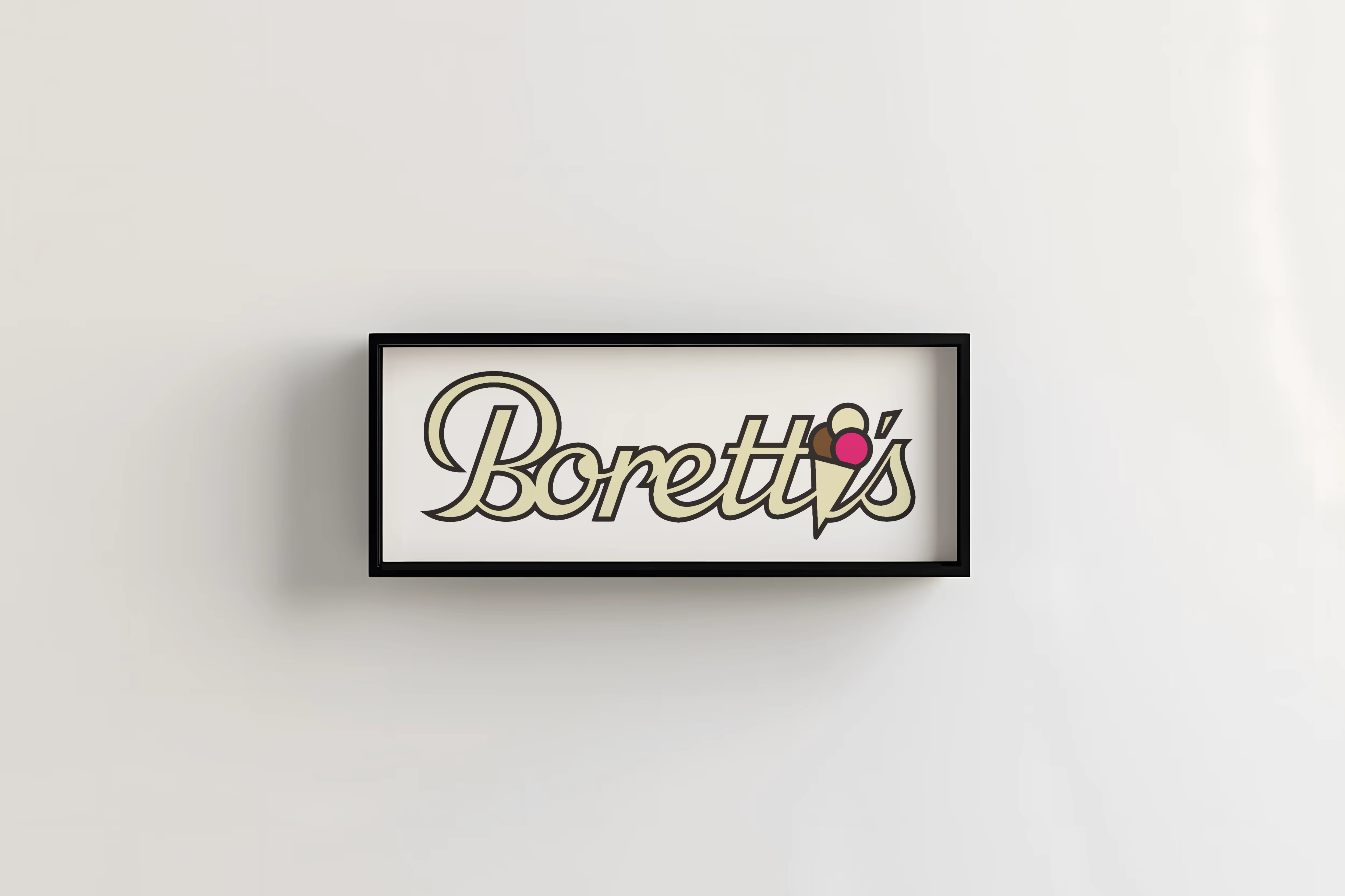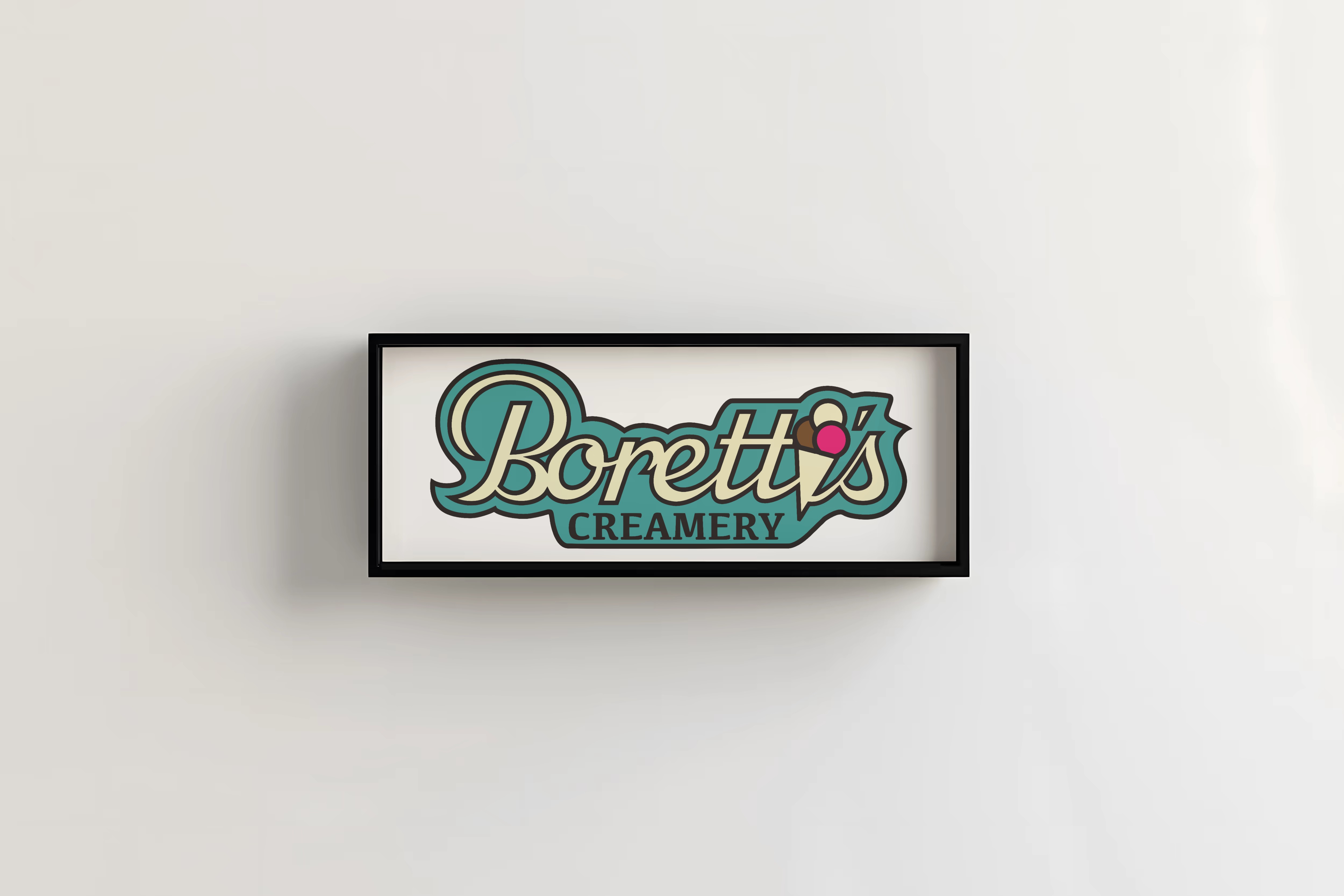 Boretti’s Creamery is a conceptual neighborhood ice cream shop built around nostalgia, craft, and personality. The brand is positioned to feel timeless and playful pulling from classic American creamery signage while still feeling bold and contemporary. The goal was to create a logo that feels instantly familiar, warm, and memorable, like a local staple you’ve known forever. For this project, I focused specifically on logo design, developing a hand-drawn script wordmark paired with a custom icon inspired by vintage ice cream parlors. The layered outlines, rounded forms, and bright accent details were intentional choices to evoke charm, movement, and approachability. The final mark was designed to be highly versatile, working across storefront signage, packaging, merchandise, and digital applications without requiring a full brand system.