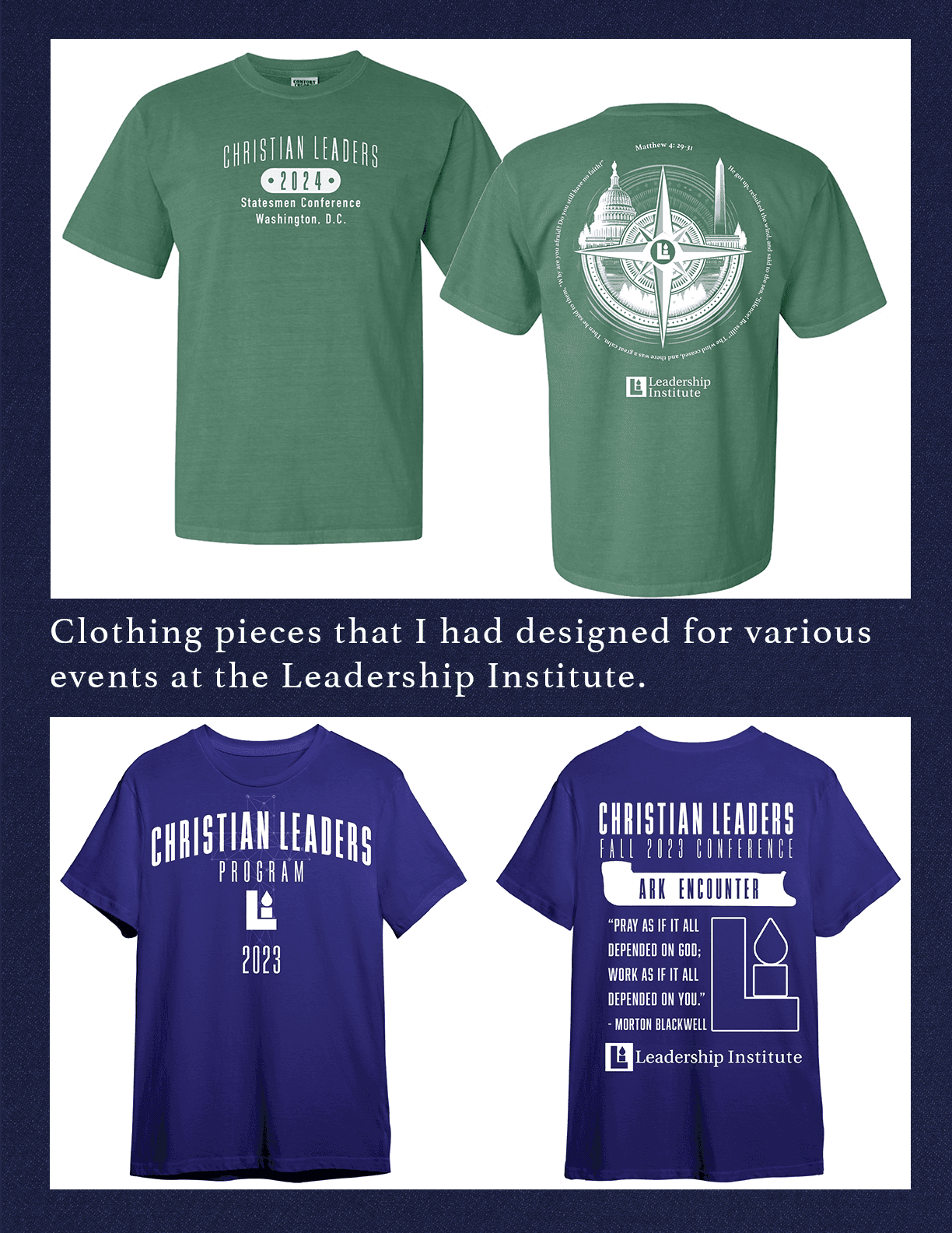 I coordinated the Christian Leaders Program at Leadership Institute in Arlington, VA, overseeing both program operations and the creative execution of the initiative. In addition to managing logistics and supporting events, I led the design and production of all visual assets for the program, including print materials, apparel, social media graphics, and promotional posters. The work focused on creating a cohesive, modern visual identity that supported recruitment, engagement, and a professional on-site experience for students and young professionals participating in the program.