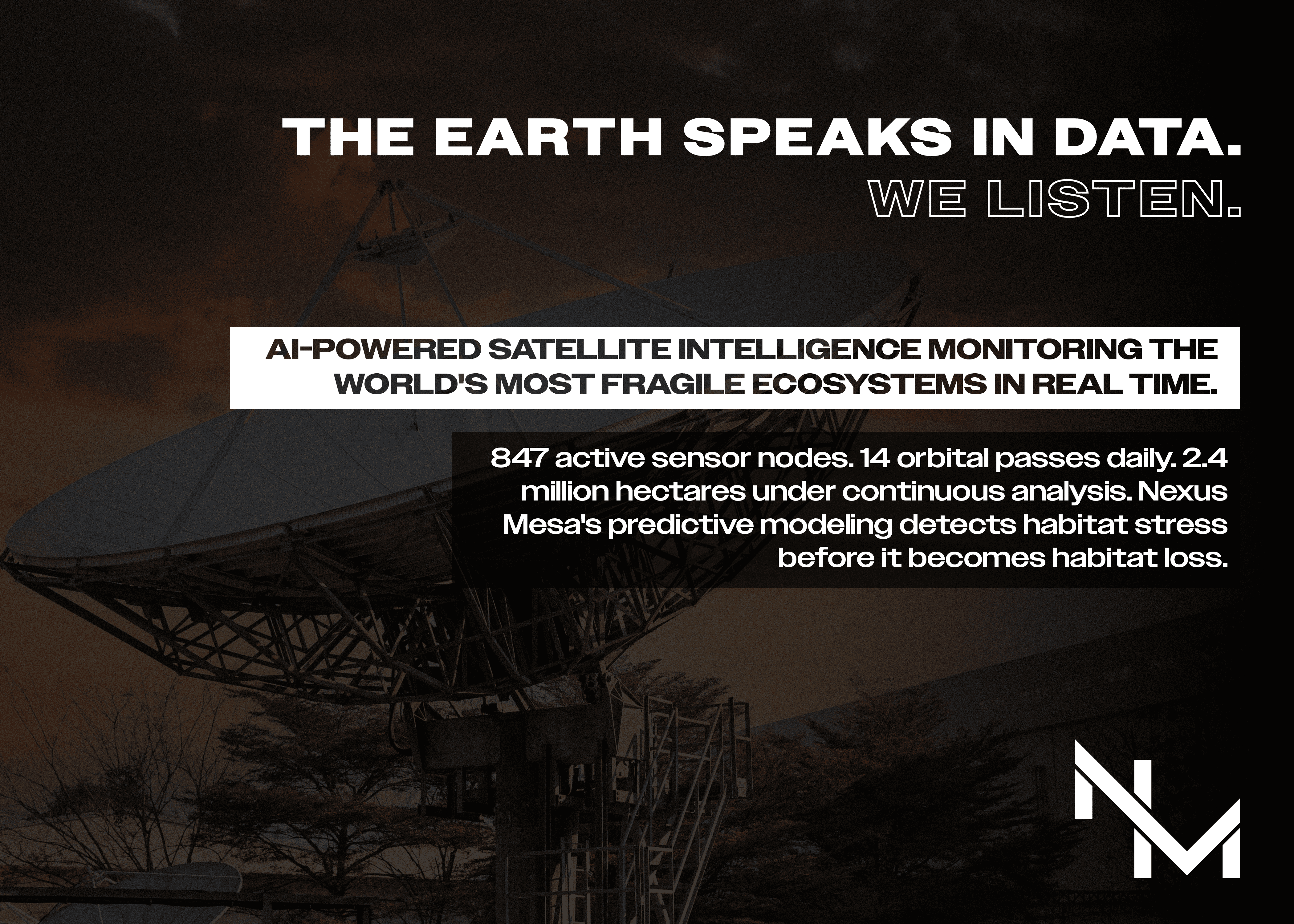 Nexus Mesa Conservation is a conceptual AI-powered environmental organization that uses machine learning, satellite data, and predictive modeling to monitor fragile ecosystems in real time. Their mission is to give conservation teams clearer insight into habitat health, emerging threats, and long-term ecological trends so they can act faster and with greater precision.For this project, I created the full brand identity, focusing on blending futuristic tech aesthetics with natural, landscape-inspired forms. I used a modern, minimal palette to communicate clarity, intelligence, and stability. The goal was to build a visual system that feels innovative yet grounded, reflecting a company driven by cutting-edge AI but rooted in environmental stewardship.