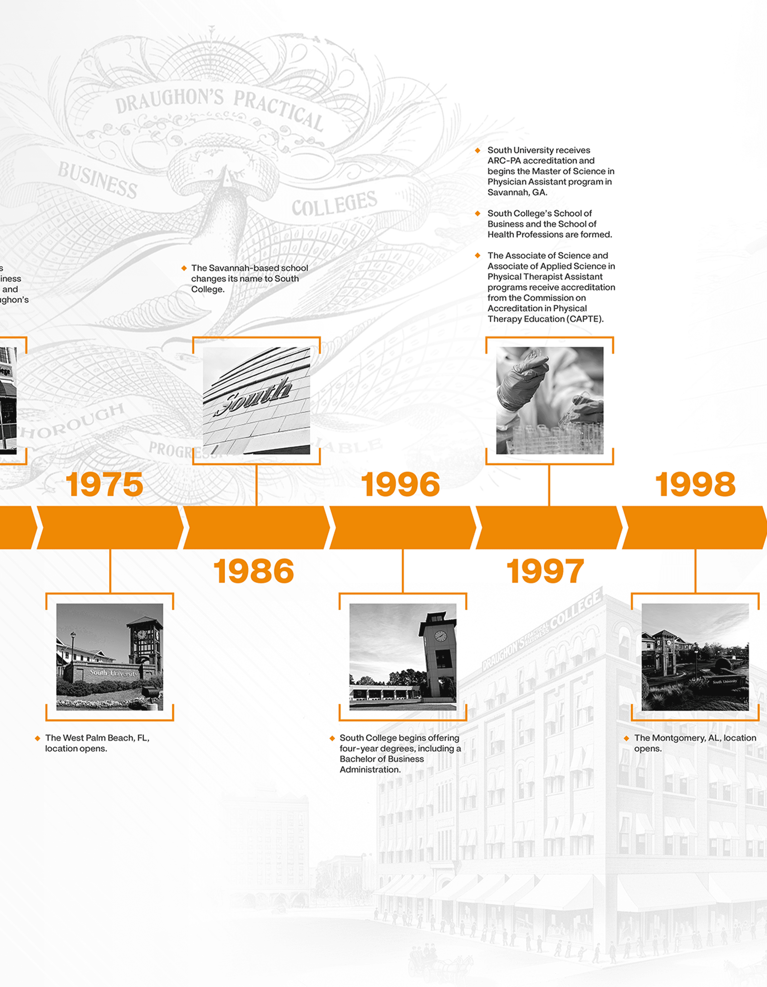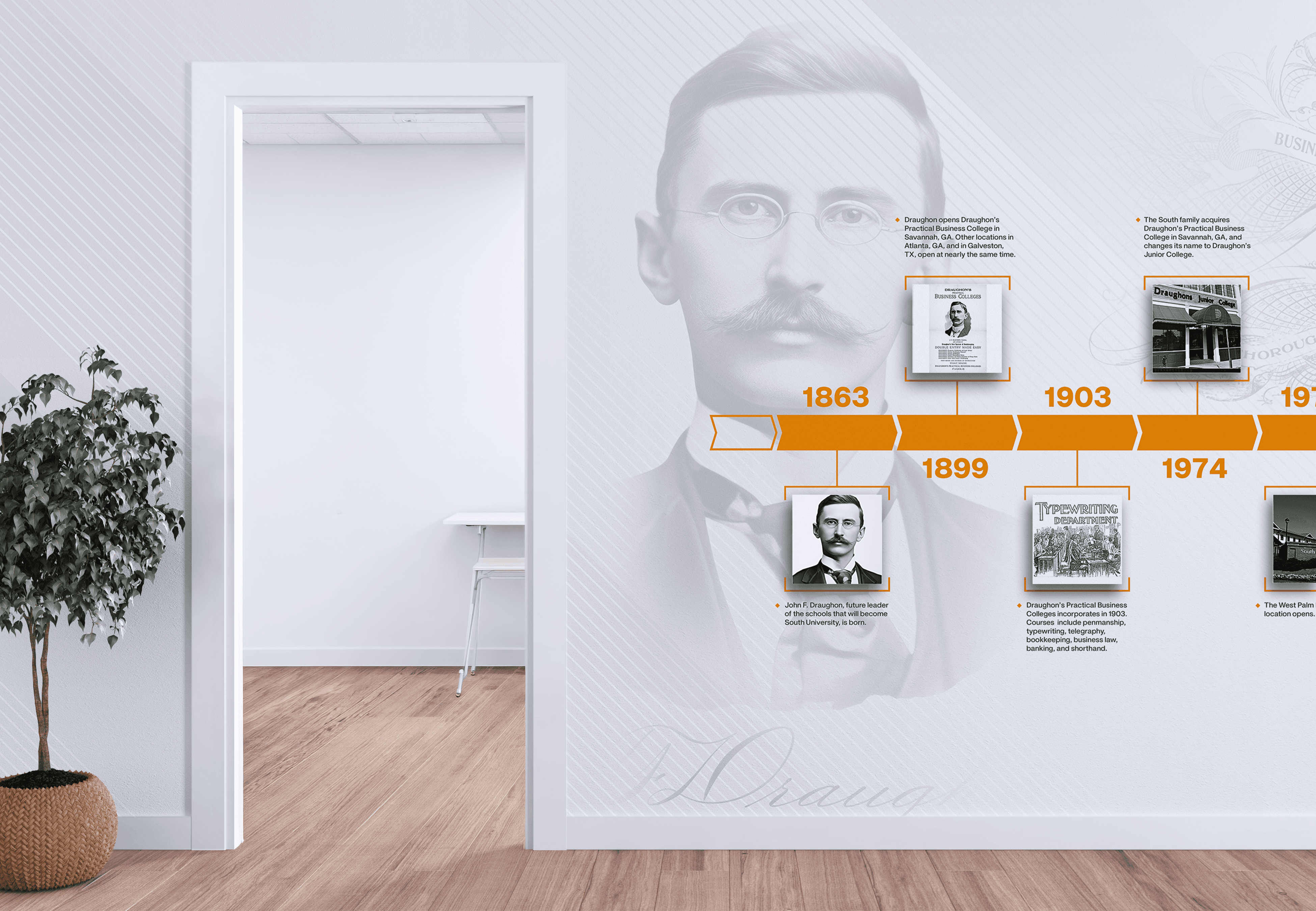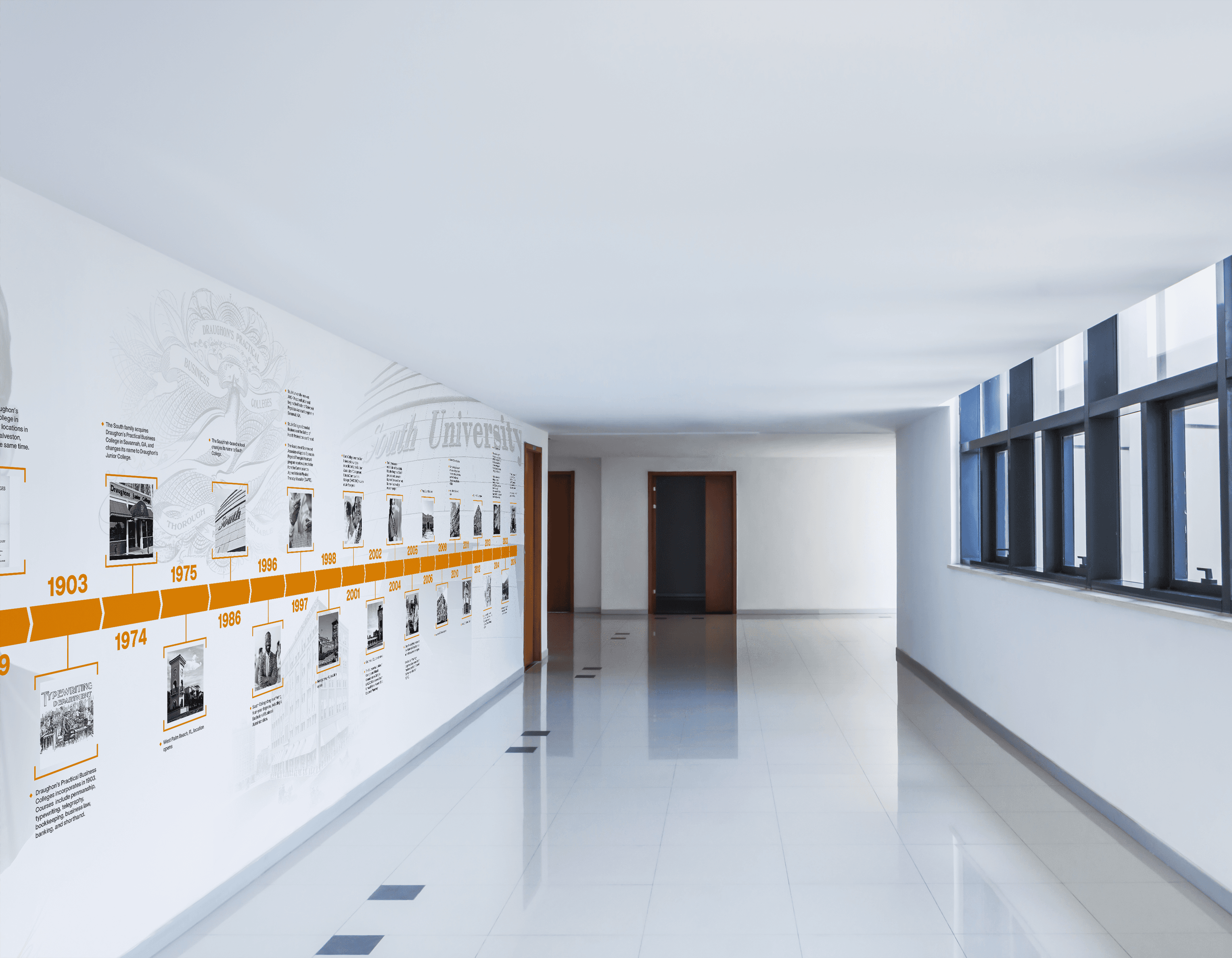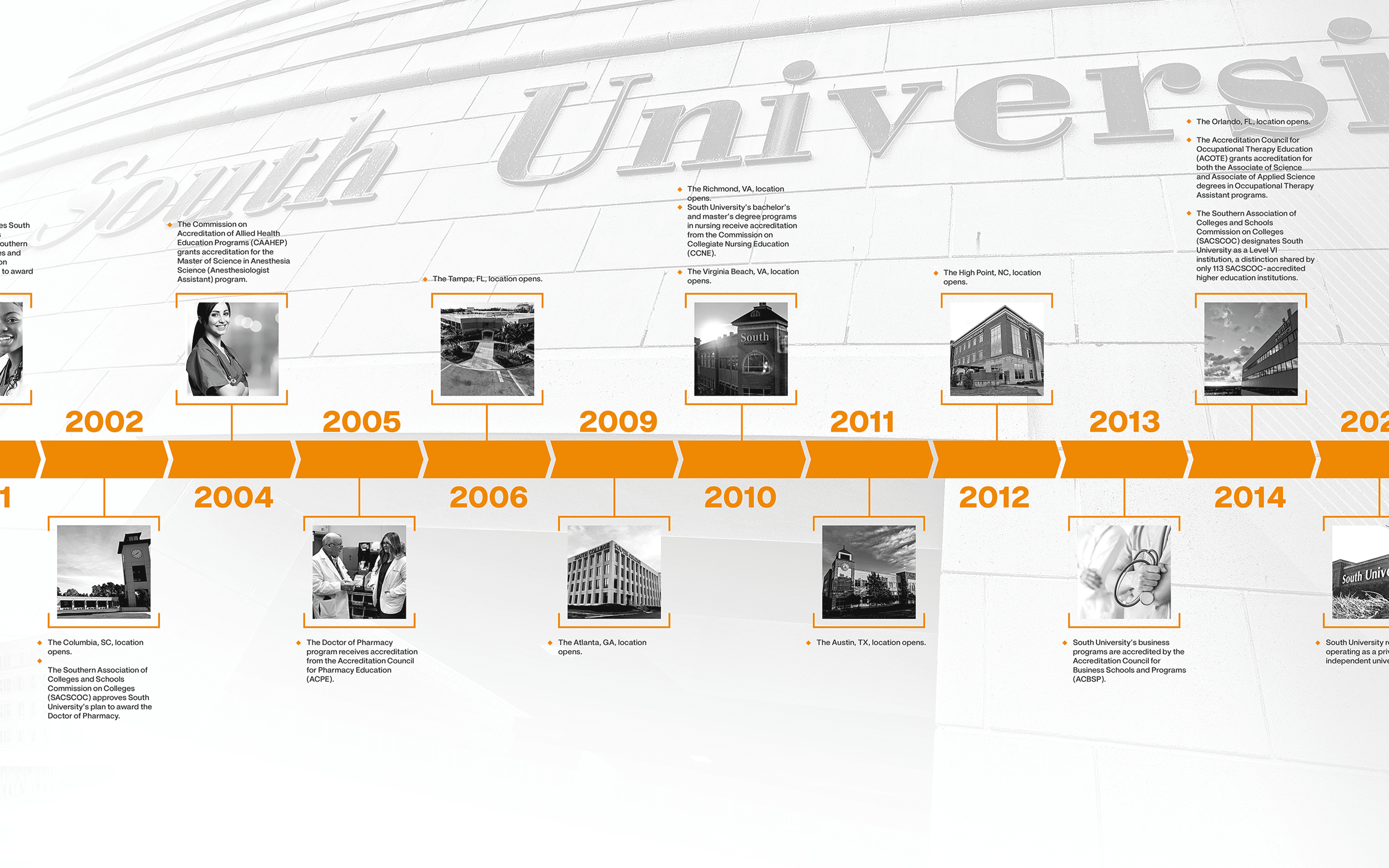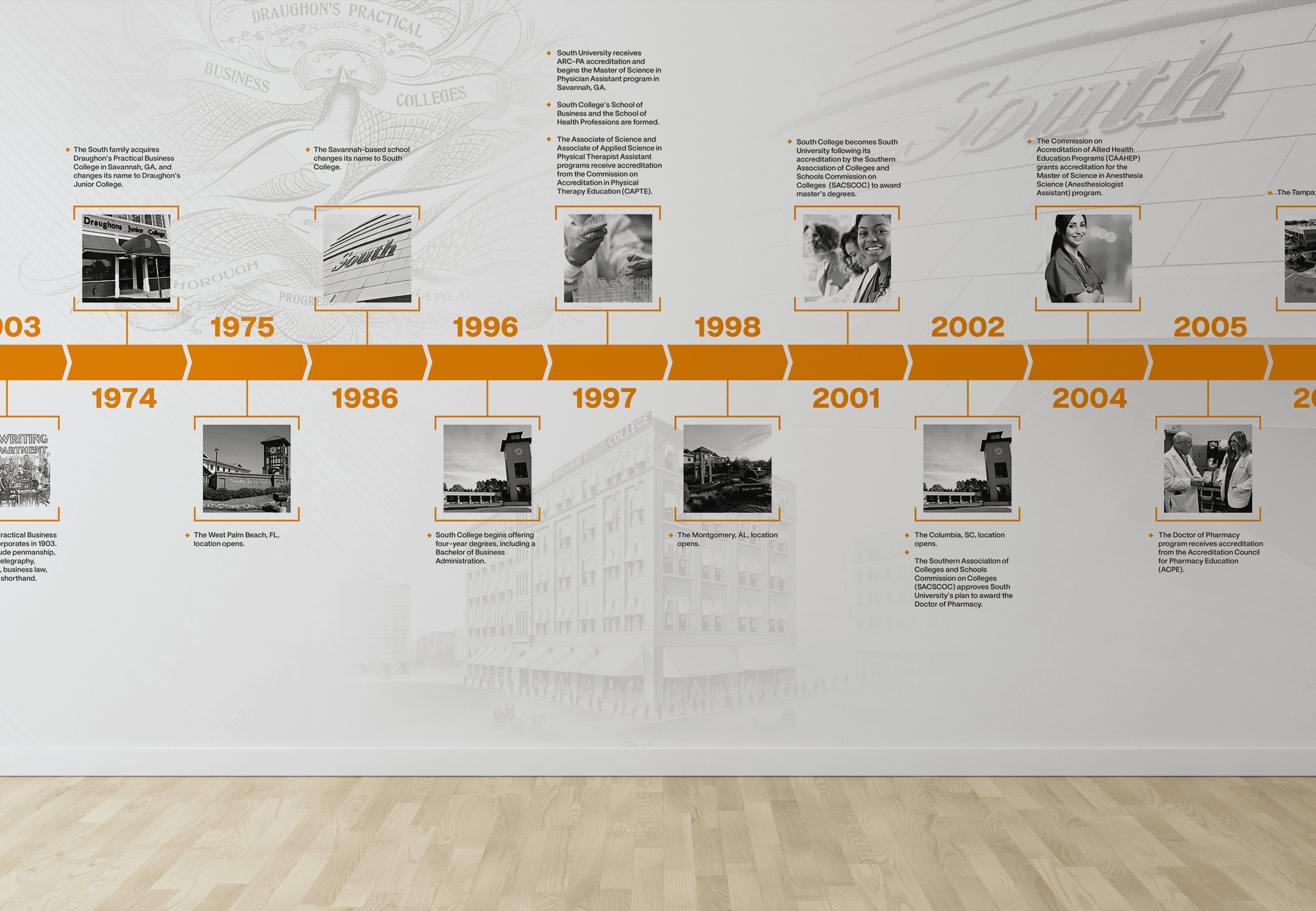 White Rabbit Creations approached me about an exciting opportunity to collaborate and create something incredible. South University sought after a timeline to highlight their story and it's monumental moments that define what it is today. The idea was to highlight it in a way that is sleek, modern, and minimal to put an emphasis on the powerful moments in the history South University.